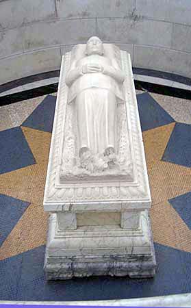 堂中有中山先生大理石坐像,高4.6米,逼真生动,是世界名雕刻家保罗兰窦斯基的杰作。像座东西四周有反映中山先生革命事迹的浮雕。祭堂东西护壁大理石刻着中山先生手书的遗著《建国大纲》和胡汉民等人书写的<<总理遗嘱>>。