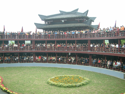 楼船组成,是《三国演义》中“火烧赤壁”、“横槊赋诗”、“草船借箭”等戏的拍摄地。曹操点将台两侧,战鼓矗立,依稀可见一代枭雄曹公当年的威仪。站在三层高的点将台上,极目远眺,水寨风光尽收眼底。陆地上的楼台堂榭与湖上的望江敌楼相峙对望,让人惊叹设计者的独具匠心和建造者的巧夺天工。整个曹营还是“火烧赤壁”这场戏的拍摄地。据统计,在拍摄“火烧赤壁”这场戏时,就动用了九台摄像机、一架直升机,从空中、陆地、水上同时进行拍摄。刹时,火光冲天,烈焰翻腾,东西绵延500米的曹营成为一片火海。曹营内,古朴雄伟的大辕门连接一条80米长、6米宽的甬道直通曹操楼船。三层高的楼船固定于湖面,游人扶舷抚舱之际,遥想1700多年前曹公踌躇满志、横槊赋诗的慷概之情,顿生“是非成败转头空”的沧桑之感。 竞技场·赤壁栈道 长约百米的古城墙下,是一座坞堡式样的竞技场馆,极具汉代特色,建筑面积达1234平方米页码:[1] [2] [3] [4] [5] [6] [7] [8] 第4页、共8页
