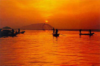 鄱阳湖是中国第一大淡水湖,位于九江至湖口的江湖相接处,上承赣、抚、信、饶、修五江之水,下接我国第一大河——长江。在正常的水位情况下鄱阳湖面积有3914平方公里,容积达300亿立方米,它每年流入长江水量超过黄、淮、海三河水量的总和,是长江水量的调节器。 烟波浩渺、水域辽阔的鄱阳湖,经过漫长的地质演变,形成南宽北狭的形状,南部最宽处达78公里,北部仅宽3-5公里,犹如巨大的葫芦系在万里长江的腰带上。以永修县的松门山为界,鄱阳湖又分为南、北两湖,北湖位于湖体之西北,亦称西