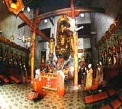 在南昌市北18公里处的港下村地段,掩映着一片金碧辉煌的建筑群,这便是湾里区最大的佛教禅地天宁古寺。天宁古寺有过极盛的年华,随着沧桑的变迁,战乱屡经文革摧残,古寺荡然无存,至85年9月仅存一座高不到二米,面积不足18平方米,风雨飘摇的观音阁,神龛上只有一张图像供游客参拜。<