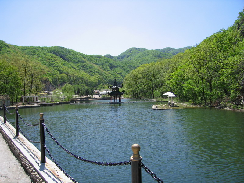 云水渡是由英纳河缓聚而成的湖,由于冰峪的东南面近海,海水形成的雾气经常大团的涌进谷口,使这里云雾笼罩,而英纳河从西北流来,在这里形成了一个美丽的大湖,云水渡是取云水共渡之意。。 双龙汇指的是流经冰峪的两条河:英纳河和英纳河的支流小峪河,此处是两条河的交汇点,水中立的巨石叫“剑劈石”,剑石周围的水域叫“月剑潭”。