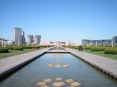 从广场中央大道中心点往北500米是会展中心;往南是百年城雕广场,500米外是蓝色的大海。中央大道红砖铺地,两侧绿草如茵,每隔20米设一个航标灯造型的石柱灯,