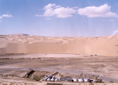 响沙湾的沙漠面积约有1.6万平方公里,沙坡斜度约50°,其上没有任何的植被覆盖,从沙丘的顶部向下滑会响起“嗡嗡”之声。响沙湾的沙鸣奇迹至今仍是一个谜团,干百年来,人们解释不了响沙的成因,却赋予它许多美丽的传说。传说很早以前;这里是一座规模宏大的喇嘛庙,正当千余喇嘛聚众颂经,击鼓吹号时,突然狂风大作,倾刻间,将寺庙掩埋在沙漠之中,这声音,便是喇嘛们冤魂未散,至今仍在击鼓、吹号的声音..... 传说固然美丽,但不能揭开响沙之迷。近年来学
