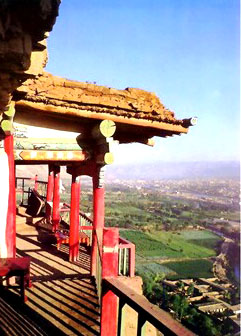 膏和芒硝层,岩性软硬相间,长期地质时期流水、风化等营力作用下,以赤壁、洞穴、险峰为主要特征的丹霞地貌得到典型发育。软岩层向里凹进,形成大小不等的洞穴,当地人称“九窟十八洞”,洞内塑有玉皇、观世音、文殊、普贤、关云长等神佛像。洞壁上所绘的神像图案、花卉山水月具有汉、藏佛教绘画艺术风格,曾有“西平莫高窟”的美称。硬岩层向外凸起,犹如屋檐,庙宇殿堂建在其上,殿宇高悬,栈道回廊将殿宇楼阁与洞穴群相连,使殿中有洞,洞内套洞,洞中藏佛,栈道回曲廊紧靠悬崖,甚至悬空架设,可称得上一座名副其实的悬空寺了。