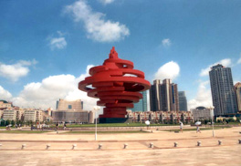广场主体雕塑《五月的风》高30米,直径27米,采用螺旋向上的钢体结构组合,以单纯洗炼的造型元素排 五四广场植物配置以四季常绿的冷季型草坪为主调,以小龙柏、金叶女贞、龟早冬青、紫叶小檗、丰花月季等组图,构成富有现代园林气息的大色块花带,松柏、合欢、耐冬等花木点缀其中,与主体雕塑和海天自然环境有机地融为一体,形成园区蔚为壮丽的景色