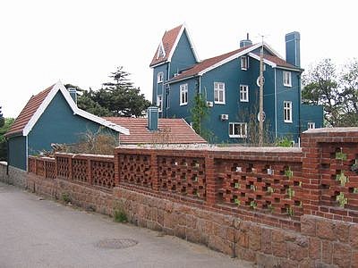 建筑,其外部由一组不规则斜顶屋面组成,南不为宽敞的方形露台,绿色外墙,宛如安徒生的童话世界。20世纪20年代,丹麦王子到青岛,经过八大关时见到此处景色怡人,濒临大海,适宜于度假修养,遂令丹麦驻青岛领事在此购地,设计建造了这座丹麦风格的建筑。原拟请丹麦公主来青岛避暑时居住,后虽丹麦公主未曾来过,但仍被称为“公主楼”。