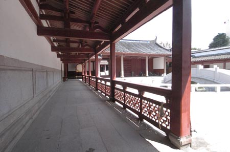 “老桧曾沾周雨露,断碑犹是汉文章”。东庑中保存着40余块汉、魏、隋、唐、宋、元时的碑刻,最为珍贵的是“汉魏北朝石刻”共22块。西汉石刻,首推“五凤”;东汉石刻,以“礼器”、“乙瑛”、“孔 宙”、“史晨”碑为隶书珍品;北朝以“张猛龙”碑为魏体楷模。西庑内陈列的100多块“汉画像石刻”,也是久负盛名的艺术珍品。这些石刻,内容丰富,既有神话传说的青龙、白虎、朱雀、玄武,又有反映当时社会生活的捕捞、歌舞、杂技、行医、狩猎,是研究我国汉代社会生活的珍贵资料。石刻的技法,有的细致精巧,有的粗犷奔放,各具风格。两庑北部陈列的584块“玉虹楼石刻”,是清乾隆年间孔子后裔孔继涑收集 了历代著名书法家的手迹临摹精刻而成的。这些石刻原被弃置在曲阜“十二府”的玉虹楼下,1951年移入孔庙,1964年装镶展出,供书法爱好者欣赏。 大成殿 从杏坛北望,在双层石栏的台基上一座金*的大殿突兀凌空,双重飞檐中海兰色的竖匾上木刻贴金的群龙紧紧团护着3个金色大字“大成殿”。字径1米,是清雍正皇帝的手书。