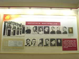 “一大”的会议室是楼下的客厅,约18平方米,室内陈设均按原样仿制。雪白的墙壁,朱红的地板,窗明几净。中间放置着一张铺着白色台布的长方形会议桌,桌上放着茶杯与火柴盒架,桌周围有12只圆木凳,东、西两侧靠墙各摆着一只茶几和两把椅子,整个会场显得十分庄严。