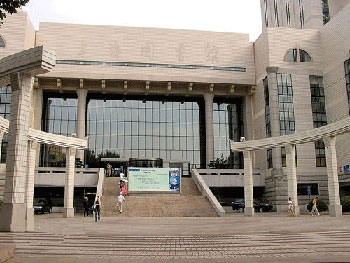 淮海中路,占地3.1公顷,建筑面积8.3万平方米。新馆建筑由高106.9米和58.8米的两座塔型高层和五层裙房组成,拥有知识广场和智慧广场,周围绿化面积达1.1万平方米。新馆于1993年3月奠基动工,1996年12月部分对外开放,1997年5月全面开放,1997年12月基本建成。图书馆设有各类阅览室和专室32个,阅览座位3000多个,个人研究室20间。 另外,还设有校舍一流、教学设施先进的教育培训基地,以及可供开展国际国内文化展示、学术交流、文化娱乐、艺术鉴赏、影视观摩的大中型展览厅、报告厅、多功能厅、学术活动室以及音乐
