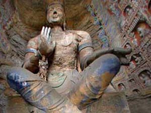 云冈石窟位于大同市西16公里处的武周山麓,依山开凿,东西绵延1公里。国家级重点文物保护单位是中国三大石窟群之一, 大佛像高大雄伟,显示举世独尊,无可对比的气概。其它石像,各按品极一个低似一个,全体服从大佛像。再配上飞天和侏儒,为大佛服役。飞天手执乐器,飞舞天空,表示在大佛庇荫下服役的愉快。 侏懦身形矮小,躯干健壮,雕刻在龛基、座础、梁下、柱顶等处,用力举重物,神情仍甚欢喜,表示为大佛服重役是快乐事。大佛象征皇帝,其它各级石像是大小群臣,飞天侏儒是各种服役的奴隶和民众。 现存洞窟53个,石雕造像5万1千余尊。大佛最高者17米,最