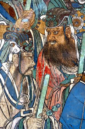 ”之说,这里的“三清”则是指元始天尊的化身。三清殿雄伟壮丽,台基高大,前檐装舸扇,四壁无窗。殿内用减柱法,空间宽阔。壁画布满四壁和神龛内外,画面高4.26米,全长94.68米,全部面积计403.3平方米,像一条巨大的彩带,环绕整个大殿。作者是洛阳马君祥父子等人,绘于元泰定二年(1325)。全殿只是一幅画,名为《朝元仙杖图》,即诸神朝拜道教始祖元始天尊的图像。中心是八个主神,帝后装束,四周围绕二百九十多个值日神,有帝君、仙伯、真人、天丁、力士、星宿、金童、玉女等。排成前后四层,形成长长的行列。主像稍大,有三米以上,朝拜者两米多。人物神情各异,有的注视,有的对语,有的沉思,有的倾听。如此众多而巨大的神像组织在统一的构图中,整齐而不呆板,繁复而不杂乱,画面强调照应,又适当注 页码:[1] [2] [3] [4] [5] [6] 第3页、共6页