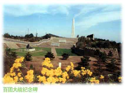 “百团大战纪念碑”矗立在阳泉市区南6公里,海拔1160米的狮脑山主峰上。这里是抗日战争时期,由朱德总司令、彭德怀副总司令指挥的名震中外的“百团大战”第一阶段的主战场之一。