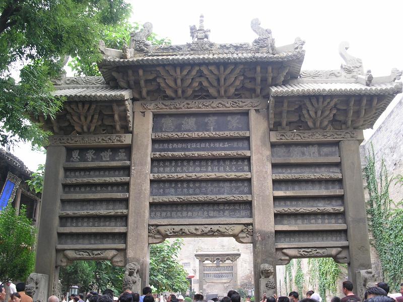 皇城相府背倚青山,俯视河川,依山随势建成了层楼叠院。院内,御书楼立于最前端,楼上陈列康熙为陈廷敬题匾“午亭山村”四个大字,同时还有康熙为陈廷敬题词:“春归乔木浓荫茂,秋到黄花晚节香”。相府正门,有高大巍峨的城堡式门楼,上方书有“中道庄”三个大字。中道庄,为皇城相府的旧称,习惯指皇城相府的外城。外城于康熙四十二年修建,主要建筑有外城城墙,家宰第、点翰堂、小姐院、翰林院、书院、花园及功德牌坊等,是一组规模宏大的清代城堡式官居建筑群。这组建筑群落风格别致,空间布局合理,充分体现官居特色,同时又与地 功德牌坊是进入皇城相府后最为醒目的牌坊。入院第一座牌坊是一座大牌坊,四柱三楼,通体石雕而成,基周瑞兽相拥,坊额雕龙刻凤,气势恢宏、壮观,正面上方刻有“冢宰总宪”四个大字,对陈氏家族官文化加以概括。“冢宰”是宰相的别称,“总宪”为都察院左都御史的别称。陈廷敬先后在朝担任四部的尚书,后入阁拜相,成为一代名臣。牌坊两侧刻有“一门衔泽”、“五世承恩”八个大字,告诉人们陈氏一门五代都受到了皇恩,再下边为陈廷敬兄弟、子侄们的官职名称。 再往里进,为小牌坊,仍是通体石雕,两柱一楼,上载从明代嘉靖到清代顺治年间陈廷敬父辈所授官职,这同样成为陈氏一门荣耀的标志。