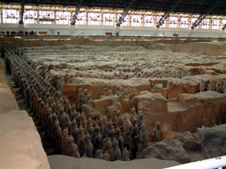 共计210件,为军阵的前锋。其后是骑兵和驷马战车,前后共38列纵队,每路长180米,战车与步兵相间排列,这是军阵的主体。军阵的左右两侧各有一列分别面向南北横队,每队均有武士俑180余件,为军阵的侧翼卫队。西端有3列横队,两列面东,一列面西,是军阵的后卫。整个军阵布局严密,酷似整装待发之势。武士俑分别执有不同的青铜兵器,近战的有刀、矛、剑、戟,射击兵器有弓弩和箭镞。其中箭长97厘米,八棱面。荆柯刺秦王曾用匕首,秦王就是用这种利剑砍伤刺客的。虽经两千多年的剥蚀,剑仍保持坚固锋利的本色。 为了保护文物和便于参观。一号坑建有拱形陈列大厅,总面积为1.6万平方米,采光良好,观众可从检阅台一睹坑内兵马俑的雄姿。 二号坑位于一号坑的东北侧和三号坑的东侧,呈曲尺形方阵,东西长96米,南北宽为84米,总面积约为6000平方米。坑内建筑与一号坑相同,但布阵更为复杂,兵种更为齐全,是3个坑中最为壮观的军阵。二号坑建有1.7万平方米的陈列大厅,是目前我国规模最大、功能最齐全的现代化遗址陈列厅。秦兵马俑博物馆官长袁仲一解释说:“一来,为的是更好地保护文物,二来,因为把整个军阵全部清出地面,起码需要5~7年的功夫。这样做的好处是游客既可以参观到二号坑局部的风采,有可以亲眼看到二号坑的挖掘工作。” 据初步推算,二号坑有陶俑陶马1300多件,战车80余辆,青 |