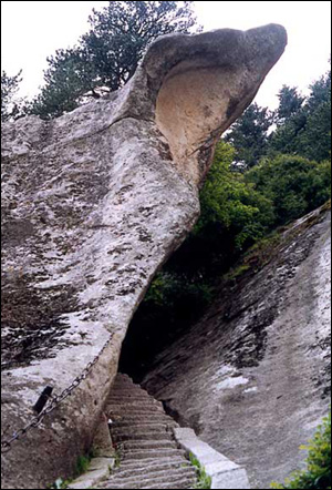 倒影便关路,流香激庙松。 尘埃终不及,车马自幢幢。 南 峰 峰南侧是千丈绝壁,直立如削,下临一断层深壑,同三公山、三凤山隔绝。南峰由一峰二顶组成,东侧一顶叫松桧峰,西侧一顶叫落雁峰,也有说南峰由三顶组成,把落雁峰之西的孝子峰也算在其内。这样一来,落雁峰最高居中,松桧峰居东,孝子峰居西,整体形象一把圈椅,三个峰顶恰似一尊面北而坐的巨人。明朝人袁宏道在他的《华山记》一书中记述南峰形象说:“如人危坐而引双膝。” 落雁峰名称的来由,传说是因为回归大雁常在这里落下歇息。峰顶最高处就是华山极顶,登山人都以能攀上绝顶而引以为豪。历代的文人们往往这里豪情大发,赋诗挥毫,不一而足,因此留给后世诗文记述颇多。峰顶摩崖题刻更是琳琅满目,俯拾皆是。冯贽在他的《云仙杂记》中记述唐诗人李白登上南峰感叹说:“此山最高,呼吸之气想通天帝座矣,恨不携谢眺惊人句来搔首问青天耳”。宋代名相寇准写下了“只有天在上,更无山与齐。举头红日近,俯首白云低”的脍炙人口的诗句。落雁峰周围还有许多景观,最高处有仰天池、黑龙潭,西南悬崖上有安育真人龛、迎客松等。 松桧峰稍低于落雁峰,而面积大一地落雁峰。峰顶乔松巨桧参天蔽日,因而叫松桧峰。华阴名儒王宏撰称松桧峰是南峰之主。峰上建有白帝祠,又名金天宫,是华山神金天少昊的主庙。因庙内主殿屋顶覆以铁瓦,也有称其铁瓦殿的。松桧峰周围许多景观,主要有八卦池、南天门、朝元洞、长空栈道、全真岩、避诏岩、鹰翅石、杨公亭等。