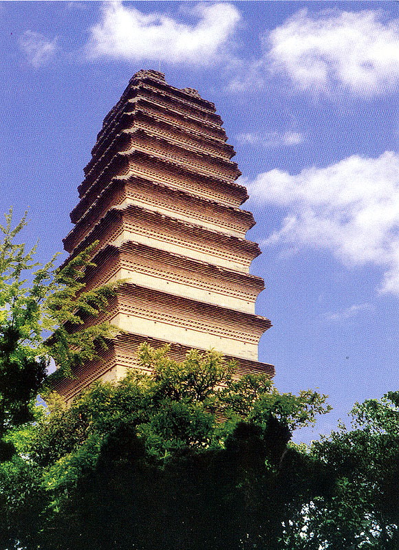 55年,华县发生大地震,小雁塔顶两级被震毁,现在只剩13级。雁塔建于唐中宗景龙年间(公元707-709年),是一座密檐式砖塔,挺拔秀丽,同大雁塔交相辉映,唐武宗(李炎)毁佛时它是京城仅存的四座寺院之一,成为古都长安保留至今的重要唐代遗迹和显著标志。“雁塔晨钟”,即指此寺铸于金明昌三年(公元119