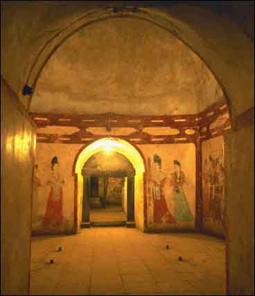 从墓道到墓室还绘有丰富多彩的壁画,有宫廷仪仗队,以及天体图、宫女图等。尤其是墓室中放置的一具石椁,石壁上线刻着15幅画面