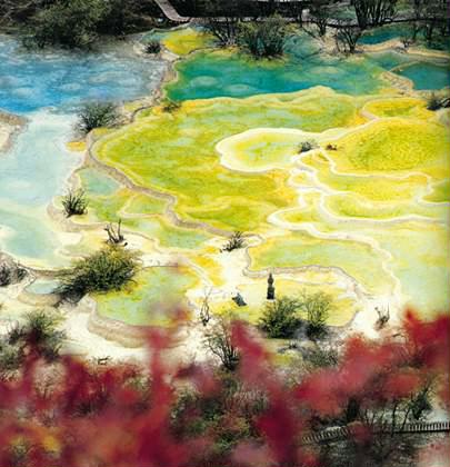 沟谷两侧山坡上满布着翠绿的原始钟叶林,沟中是金黄凶蜿蜒的钙华滩流,边接着成百上千个千姿百态、斑斓夺目的钙华彩池。地质学把