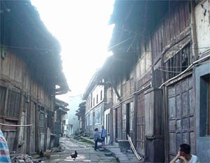 游罢码头,信步踏进老街,这是一条叫胜利街的小巷,两边几乎都是木屋建筑,许多房子已人去楼空,我们到达这里的时候,时间尚早,只见一些人家门前坐着个姑娘或小媳妇,很仔细地梳理着一头瀑布般的秀发,没有摩丝,没有发卡,那份投入唤醒了我们久违了的感动嗅惯了现代都市种种化学气味,乍遇上这一份清纯,怎不让我们怦然心动呢?沿石径走向山顶,蓦然回首,只见老街两边屋檐骤合,在初冬清晨的雾中,恰似一仙子”犹抱琵琶半遮面”这种感觉怕在新城是难以找寻到的。民主街建在山顶上,因有所小学,所以少了宁静。难能可贵的是,这理居然还保留有吊脚楼。立在楼下我不禁心驰神往,想象夏夜沐浴之后,躺在脚楼凉椅上,蒲扇轻摇,山风徐来那等惬意,自不是每个人都能享受得到的。