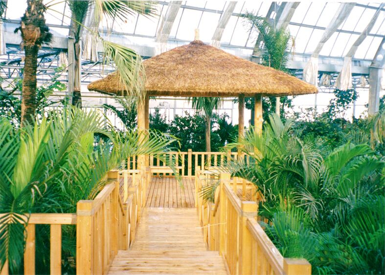 ![]() 热带雨林厅简介 热带雨林厅是植物观光园中浓墨重彩的一笔。峰峦叠翠、云雾缭绕,银河飞泻、泉水叮咚,鸳鸯戏水、鸟语花香,宛如进入了人间仙境。主峰高十多米的假山,使数千里之外的贵阳黔灵山丰