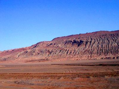 火焰山脉呈东西走向。东起鄯善县兰干流沙河,西止吐鲁番桃儿沟,长100公里,最宽处达10公里。火焰山重山秃岭,寸草不生。每当盛夏,红日当空,地气蒸腾,焰云燎绕,形如飞腾的火