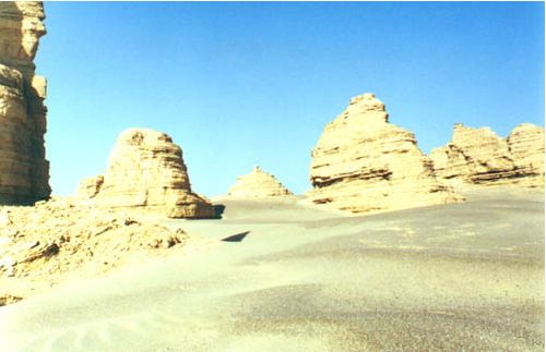“雅丹”,又名“雅尔当”,是维吾尔族对“陡壁的险峻小丘”的称呼,这种地形在罗面泊周围的雅丹地区发育得最典型,分布面积最广。最为壮观的是“龙城”,位罗布泊古湖盆东北部,是一片风蚀最强烈的地区,土丘高峻似城廓宫阙,其形似龙伏卧,巨大的土墩台高达12至20米,侧壁陡立,极难攀登。从侧壁断面上可以清楚看出水成的层理;下部是厚层的灰绿色砂层的粉砂层和互层,最上面是一层淡红色的粉砂粘土层,由碳酸钙胶结得非常坚硬,形成一个保护层,使土丘顶面非常平坦。