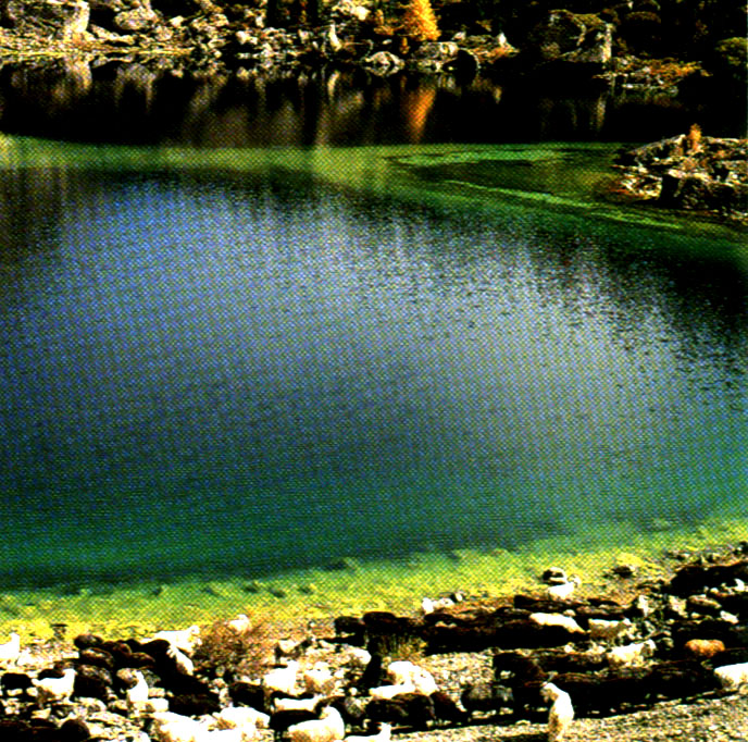 阴坡层层叠叠的雪岭云杉远接雪岭蓝天;湖东侧进水口,溪水散成辫状,汨汨注入湖中,滨湖形成一片丰美的湖滩草甸。