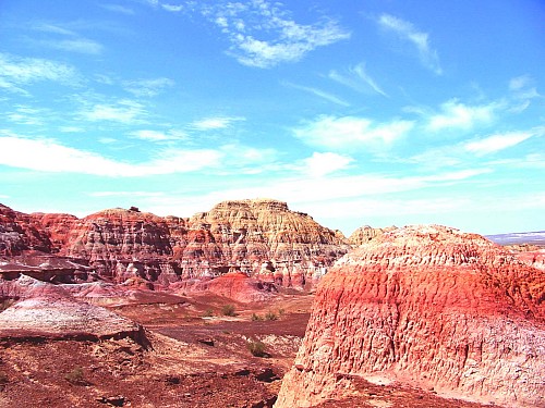五彩湾:位于昌吉州吉木萨尔县城北,在一片戈壁荒漠中有一个五彩滨纷的世界,那就是以怪异、神秘、壮美而著称的五彩湾。这是一幅大自然的杰作。千百年来,由于地壳的运动,在这里形成极厚的煤层,后几经沧桑,覆盖地表的沙石被风雨剥蚀,使煤层暴露,在雷电和阳光的作用下燃烧殆尽,就形成了这光怪陆离的自然景观。