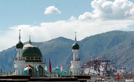 拉萨清真寺位于拉萨旧城东南河坝林回族聚居区,始建于18世纪中叶。寺址东西向,沿中轴线前后设有三进院落。建筑群由牌楼、礼拜殿、邦克楼、浴室、水房、林卡等组成。礼拜殿朝东,分内殿、敞厅、月台等。敞厅内悬挂有“清真古寺”匾额。