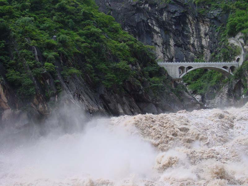 关于虎跳峡的形成,当地民间流传着一个优美的故事:金沙江、怒江、澜沧江和玉龙山、哈巴山,原是五兄妹。三姐妹长大了,相约外出择婿,父母又急又气,要玉龙、哈巴去追赶。玉龙带着十三把剑,哈巴挎着十二张弓,抄小路来到丽江,面对面坐着轮流守候,并约定谁放过三姐妹,就要被砍头。轮到哈巴看守时,玉龙刚睡着,金沙姑娘就来了。去路被两个哥哥挡住了,怎么办呢?聪明的金沙姑娘想起了哈巴有爱打瞌睡的毛病,便边走边唱,一连唱了十八支歌。婉转动人的歌声果然使哈巴听得入了迷,渐渐睡着了。金沙姑娘瞅准这一机会,终于从两个哥哥的脚边猛冲过去,大声欢笑着飞奔而去