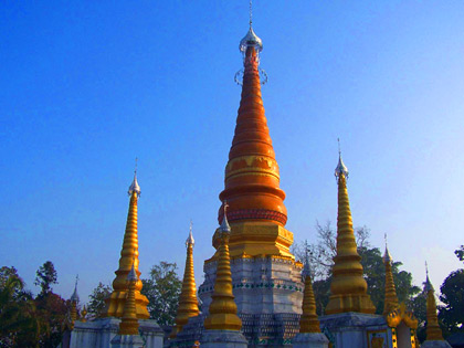 姐勒金塔,傣语称“广母贺卯”,意为“坝子头的塔”。它坐落在瑞丽市姐勒乡政府驻地西南约300米的土丘上,“320”国道从其下穿过。