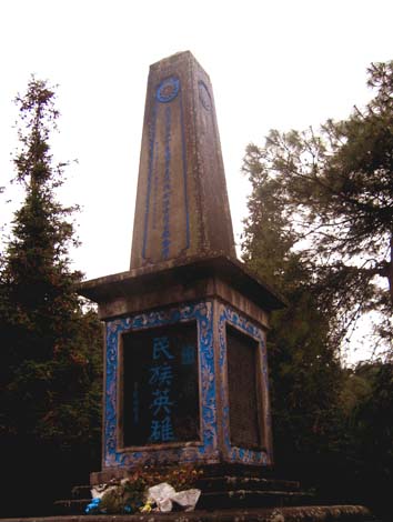 国殇墓园,建成于1945年7月 7日,占地88亩,主体建筑以中轴对称,台阶递进形式,由大门经长通道循石级而上至第一台阶,再循古级而上,至嵌有蒋中正题李根源书之“碧血千秋”刻石的第二台阶档土墙,沿培分两侧上至第二台阶,建有庄严肃穆的忠烈祠。忠烈祠为重檐敬山式建筑,上檐下悬蒋中正题“河岳英灵”匾额,捐堂正门上悬国民党元老大书法家于右手书的“忠烈祠”匾额,祠内外立柱悬卦何应钦及远征军二十集团军军师将领的题联,走廊两侧有蒋中正签署的群护国殇墓园的“国民政府军事委员会布告”,二十集团军总司令何
