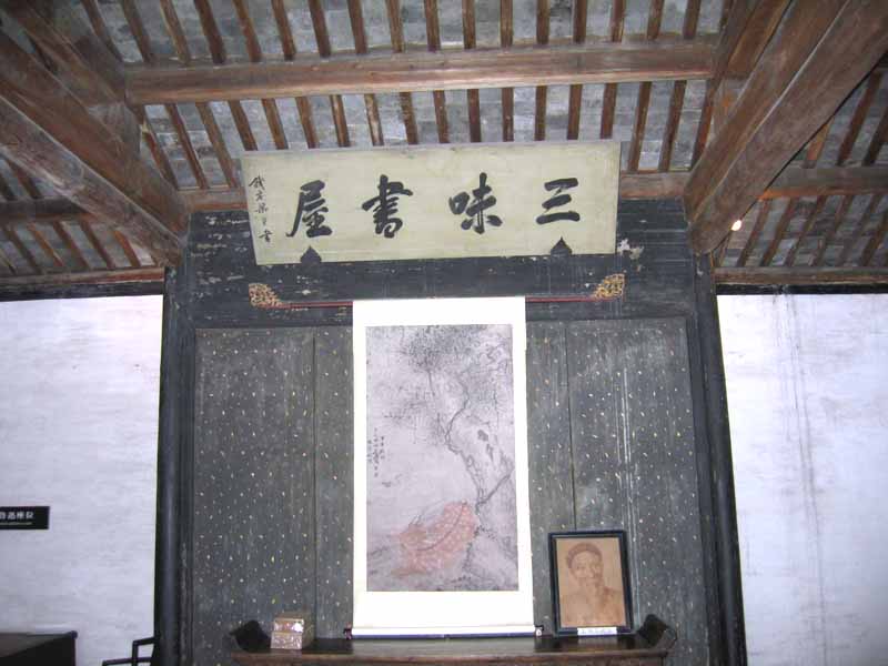 在第一进台门斗的西边,穿过天井,有一小方竹园,竹园的北边厢房我们现在把它布置成“三余书屋”,“三余书屋”是“三味书屋”