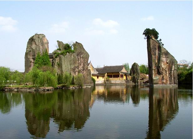 据志书记载,隋开皇年间载国公杨素为筑罗城,使其成为残山剩水,四周悬崖峭壁,内有奇岩怪峰,形如一座石城。古代好事者相继在最高的一座孤岩峰,开凿石窟,窟内留石凿成一尊面呈慈祥、气韵生动的弥勒石佛,后依岩筑建石佛禅寺。 ![]() 石佛寺四周环水,有碧波荡漾的放生池和羊山湖。羊山湖中湖洲相托,孤石罗列,更有挺拔雄奇的灵鹫峰、城隍峰、普渡峰、无名峰耸峙。峰顶古柏苍劲,奇趣盎然;峰壁石刻成群,领略历史。湖岸有成片的桂树,湖边有兀突起伏的九曲崖壁,呼声回音。三座形态不一,各具特色的石、木桥飞架南北,把岸、湖、洲、岛贯通一线,游客乘船可穿桥洞、环岛屿
