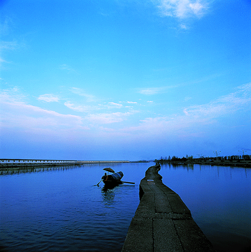 鉴湖原名镜湖,相传黄帝铸镜于此而得名。鉴湖还有长湖 、庆湖、贺家湖、贺监湖等别名。鉴湖水质特佳,驰名中外的绍兴老酒,即用此湖水酿造。鉴湖湖面宽阔,水势浩淼,泛舟其中,近处碧波映照,远处青山重迭,有在镜中游之感。鉴湖不仅有独特的自然风光,还有许多名胜古迹为之增色。湖东岸有马臻之墓,当年他发动民众兴修水利,却得罪了豪绅,被诬告致死,后来会稽百姓设法把他的遗骸运回,安葬于
