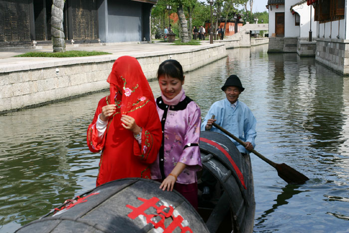 一走进鲁镇,但见粉墙黛瓦的古居、枕河临街的店铺、静穆庄严的寺庙、千姿百态的石拱桥、古色古香的石板路、纵横交错的深水巷,绍兴的桥文化、石文化、水文化、酒文化、名士文化扑面而来。豪华气派的鲁府、外土内洋的钱府、旧木板房的民宅错落有致,鲁迅小说中写到的鲁家祠堂、奎文阁、阿Q调戏小尼姑的静修庵和阿Q栖身的土谷祠,一一呈现在眼前。 “鲁镇”是绍兴典型的白砖黑瓦、一河一湖两街的建筑格局,让人仿佛走进了一个旧时“人家尽枕河,楼台俯船楫”的水乡古镇,只是这个“古镇”新了一点。