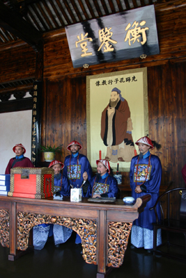 048年迁移到现址。历代累有兴毁,现存的孔庙仍保持清代光绪年间原貌。占地约7000平方米,共有祠、阁等房屋137间,建筑布局完整,气势宏大。中轴线上由南向北分别为棂星门、泮池、大成门、大成殿、明伦堂、梯云亭;两侧的左右轴线上也对称地建有祠、阁,体现出儒家“中和为美”的审美标准。 县衙