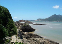 情人岛原名后门山,位于朱家尖岛中部东侧,岸距南沙与东沙之间的岬角约百米,退潮时可涉足通过。岛呈长形,西北东南向,长千余米,从高处俯瞰,犹如一个“人”字形半 岛。1997年情人岛与朱家尖架起了一座122米的悬索桥,从此可不再候潮游览。游人行走在悬索桥上,桥下潮流滚滚,很是一番景致。情人岛面积虽 然小,只有0.2平方公里,但她却以小巧玲珑和海山奇观展示着自己独特的美。因此,如果说沙滩给人以舒适的休闲乐趣,那么,情人岛则给人以轻松的浪漫情调。