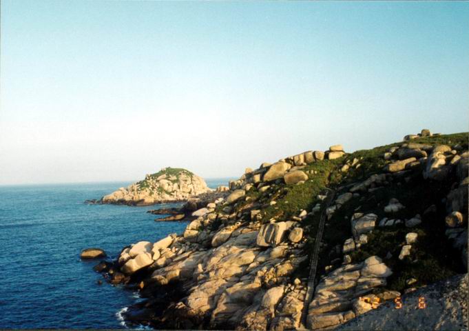 南麂山向东南延伸有头屿、二屿、三屿,按山丘高低层次来分,有头盘、二盘、三盘,一直延伸到南麂岛东南之尾部。三盘尾之名称由此而来。它是南鹿岛自然景观中.观望海景最佳之处。春夏秋 冬、晴雨晨昏,在这里欣赏景物,兴味迥异。 望夫石 三盘尾的后村东北向山背上,最立着一尊人岩石,像一个渔妇,披着长发,朝向南方,聚精会神地凝望大海,殷切等待出海捕鱼的丈夫安全归来。“脚踹船板三分命”,渔民的妻子,谁都有这种共同心声。 月明星稀时,这望夫石又成为老母亲在招唤儿子,嘶哑的喊声被海涛淹没了,她噙着满眶热泪盼望海峡彼岸游子早日归来。 猴子拜观音 三盘尾南部