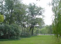 水荡沼泽而营造的大草坪,草色遥连西湖碧波青山,大草坪北侧,是迁建来此的康熙御题柳浪闻莺景亭碑;南侧种植了一片高大的乔木树林,与草坪、柳岸及湖光山色