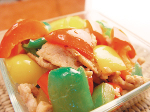 烹制方法 (两人份) 材料: 青菜椒(1个)、黄菜椒(1个)、红菜椒(1个)、猪肉(3两)、蒜头(3瓣) 调料: 油(5汤匙)、酱油(1/2汤匙)、盐(1/3汤匙)、鸡粉(1/2汤匙)、生粉