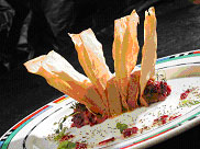菜品名称:拿破仑鹅肝配起酥面和洋葱酱 菜量(几人食用):2人 价位(特价):95 RMB 香煎牛眼排配香草和他拉根番茄酱 |