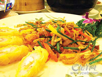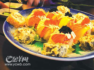 比较素的一道菜,味道清香却不寡,和黄金卷搭配的创意不错。建议在菜名里加入虾干二字,因为虾干属于比较贵的原材料,和小炒的概念不太相同。 (记者 朱颖洁文/图) 创新点在于寿司的外皮比较松脆,口感很香。 ●品尝地点 A=世纪明珠海鲜酒楼(荔湾路78号) B=水稻田酒家(横枝岗路隆