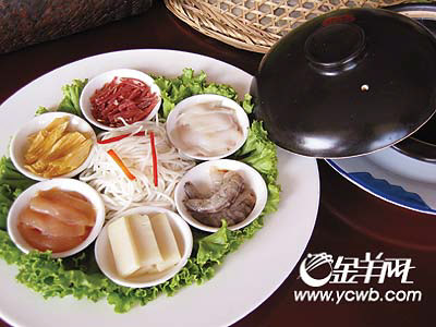 秋食香菌冬喝根 天厚云南,丰富的动植物资源为滇菜提供了广泛的原料。山珍是云南特产,一般到云南旅游的人都餐餐离不开炒野山菌。云南有句谚语:“春吃鲜花夏品果,秋食香菌冬喝根”。眼下云南菌类全面进入“黄金时代”,上百种的菌类让人难以叫齐名字。除了清炒、配菜,将菌类与肉类一并熬汤是食客们的至爱。如炖鸡本来就是一道传统的滋补佳品,加入各类野山菌后滋补价值更高。炖制过程中加入羊肚菌、鸡纵菌、竹荪、黑虎掌菌、鸡油菌、茶树菇,再加上大枣,口感顿时变得丰富起来。