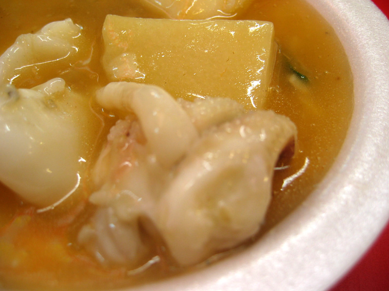 于是,第二天Jane带我逛完故宫博物院后就直奔士林夜市。士林夜市好大的几个街区,小吃集中在一个大市场里。 首先是先开开胃,药炖排骨。虽然Jane也不知道是什么药炖出来的,但味道真的是很鲜美,可惜没等想起来拍照就吃完了。 下一个摊位就是Jane最喜欢的炒花枝了。有些虚焦了,大家将就看看吧,虽然汤上漂着一层油,但花枝的鲜味早已让人忘了这些。 还