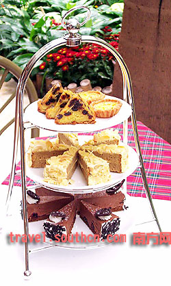 2、点心 最下一格是黑车厘子巧克力饼,70%、80%的巧克力用带果酱的黑车厘子做配料,使巧克力更滑更香浓。 中间一格是蜂蜜威士忌蛋糕,这是最典型的苏格兰食品。苏格兰人喜用蜜糖而不用白糖,喜欢极甜的甜品,在烹饪食品当中,也喜用威士忌作调味。