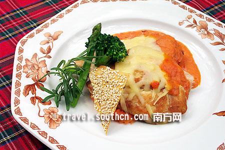 4、芝士局鸡肉块 把用特别配料腌制过的鸡肉块用威士忌烹制而成。苏格兰的威士忌是全世界最好的,而格兰菲迪麦芽威士忌更是苏格兰威士忌中的极品,素有“液体金子”之称。地道苏格兰高地风味美食当中,许多都是选用威士忌做配料制成的。'