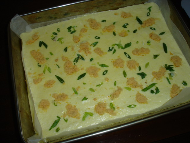 倒入烤盘抹平,在表面撒上肉松和葱粒