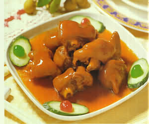 菜系 广东菜 材料:鲜猪手300克、冬茹10克、生姜10克、蒜子10克。 调味料:花生油20克、盐10克、味精8克、白糖5克、老抽王10克、麻油5克、湿生粉15克、绍酒、鸡汤150克。 1、鲜猪手烧净毛,洗干净切成决,冬茹切片,姜切片,蒜子肉用油炸金黄。 2、烧锅下油,先放下