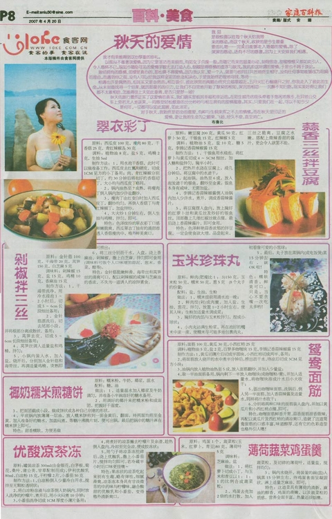 这个活动是托色尘姐的福。她是这个报的专栏作者 ,由她负责每期推荐一位美食DIY者上报。已经成功举办数期。向她报名后,懒懒的我把以前做的菜和写的文章稍做整理,就发给她了。时隔半月,就看到了这副图。这是2007年4月20日的,家庭百科报的美食版。好象是河北省出版的全国性报纸,但广州报摊上应该是见不到的。样报尚未收到,稿费也未知几许。虽然以前也有过文字作品登过报,但作为美食方面的,登报还是第一次,尤其还是整版...... 小小地页码:[1] [2] [3] [4] [5] 第1页、共5页